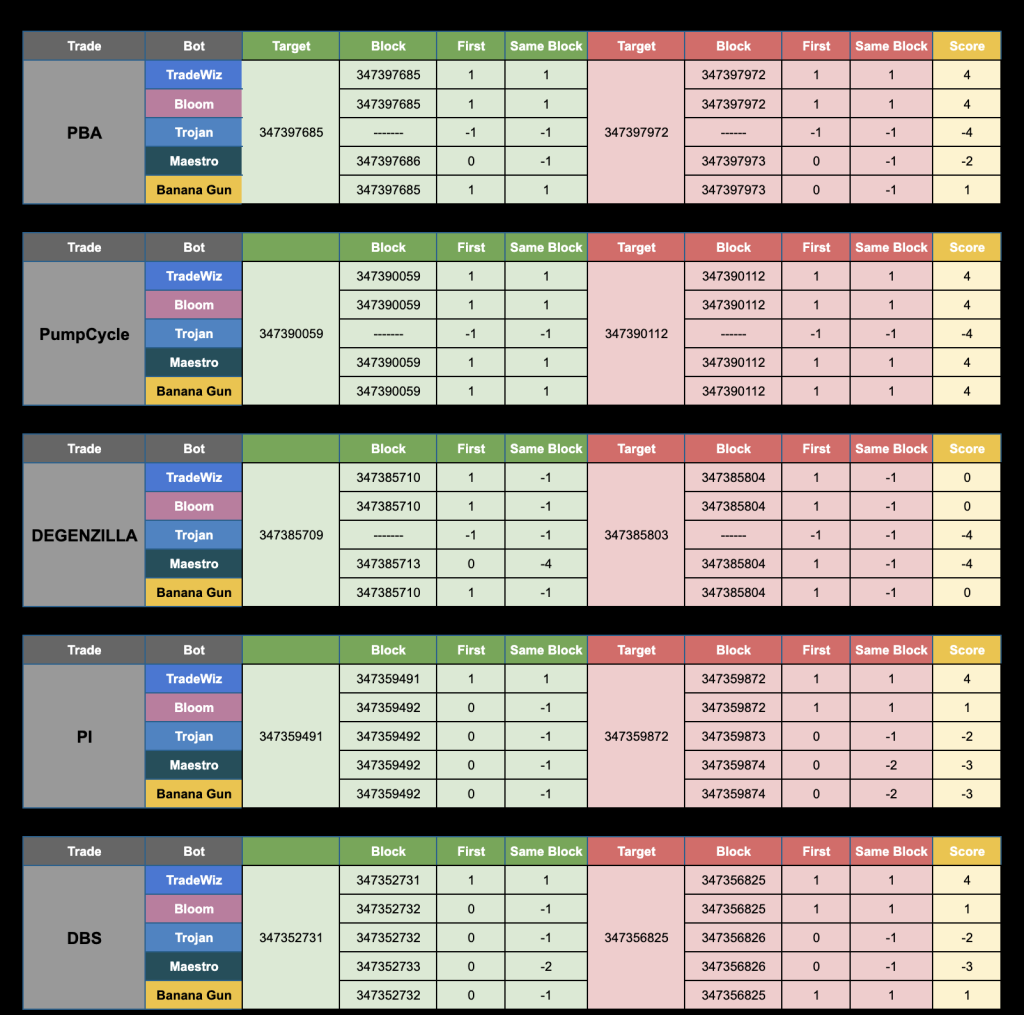This system meant that a perfect score for a single trade (both buy and sell) was 4 points, achieved by being the first to execute both buy and sell orders within the same block as the target wallet.