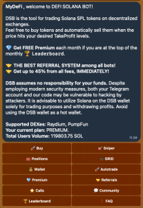 - Premium Subscription: Subscribers to the premium service gain access to enhanced functionalities and potential cost savings, providing an upgraded trading experience.citeturn0search2 y leveraging Defi Solana Bot, traders can automate their strategies, efficiently manage their portfolios, and take advantage of the dynamic opportunities within the Solana ecosystem.